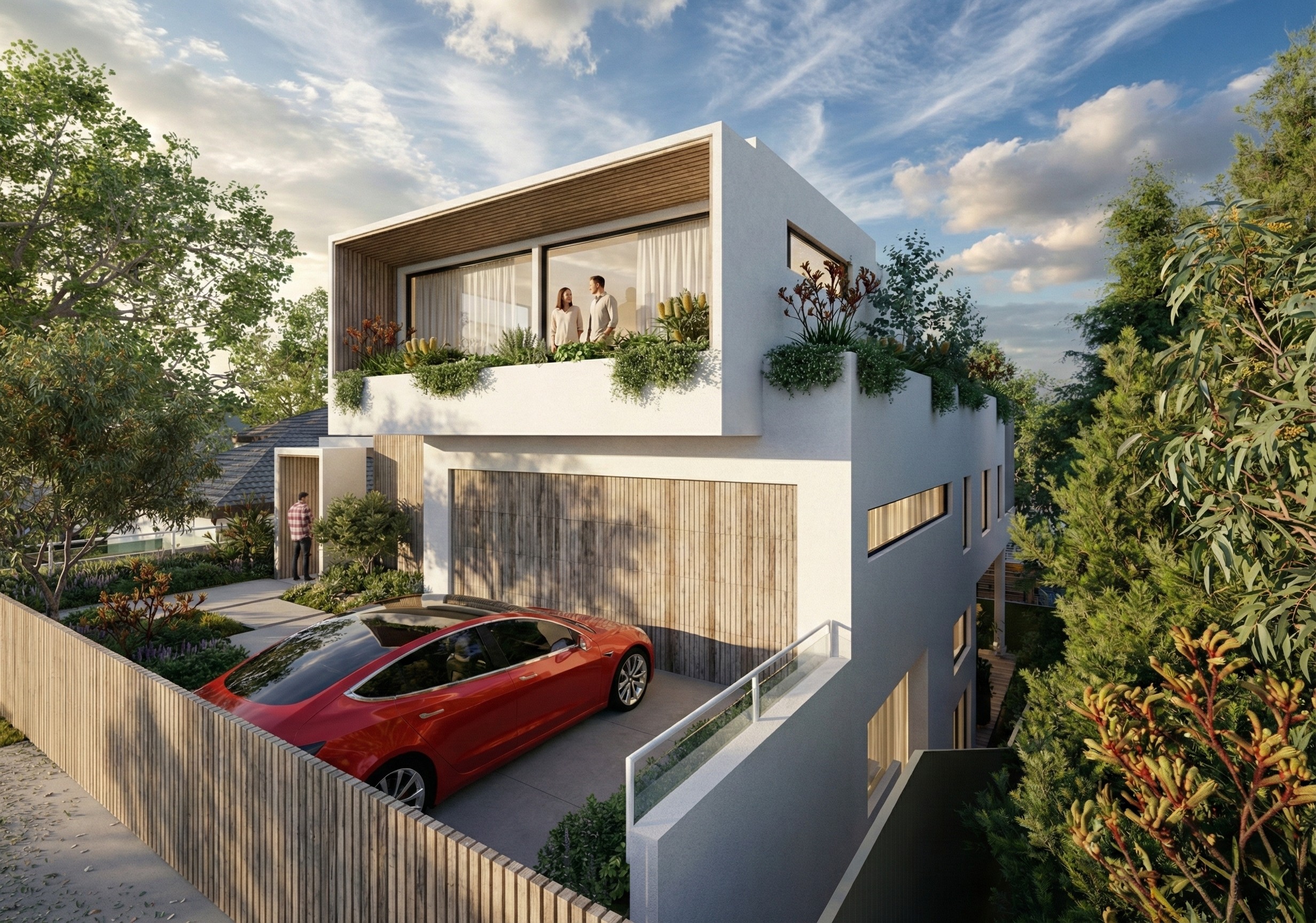 Embracing the essence of contemporary Australian living, this residence effortlessly blends bold architectural forms with the softness of the native landscape. The design features a striking interplay of crisp white rendered surfaces and weathered vertical timber battens, creating a textural facade that anchors the home within its leafy context. Expansive floor-to-ceiling glazing, softened by sheer drapery, dissolves the boundary between the interiors and the alfresco timber deck, fostering a seamless indoor-outdoor lifestyle. Surrounded by a curated garden of Australian natives the home stands as a sophisticated yet inviting sanctuary that comes alive with a gentle, welcoming glow at dusk.